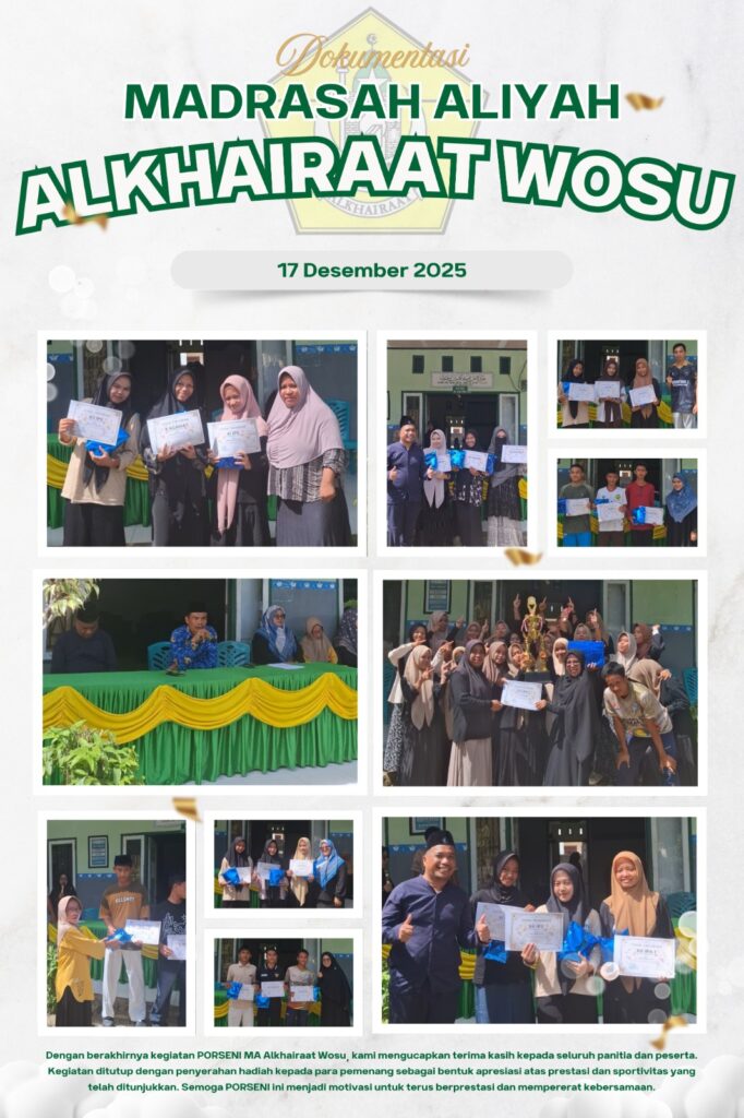 MADRASAH ALIYAH (MA) ALKHAIRAAT WOSU ONLINE– Pekan Olahraga dan Seni (Porseni) Madrasah Aliyah Alkhairaat Wosu yang berlangsung selama 10 hari, dari tanggal 8 hingga 17 Desember 2025, resmi ditutup setelah berlangsung meriah dengan berbagai kompetisi yang mempertemukan siswa-siswi dalam ajang sportivitas dan kreativitas. Acara penutupan yang digelar di lingkungan MA. Alkhairaat Wosu pada Selasa (17/12) ini berlangsung hikmat dan penuh kesan.
